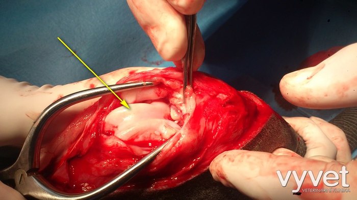 Na snímku je šipkou zvýrazněn sval jenž znemožňuje čéšce správnou polohu v kolenním kloubu. Nejčastější příčinou je deformita stehenní kosti.