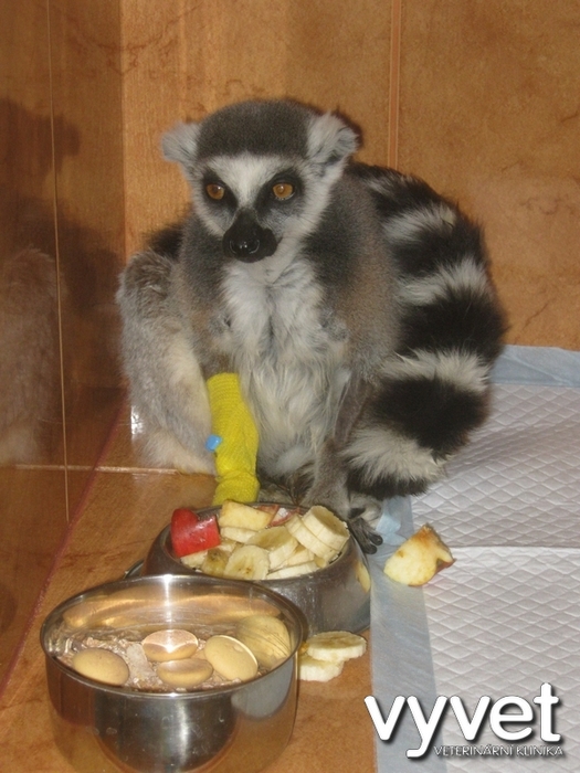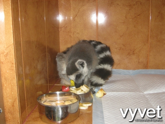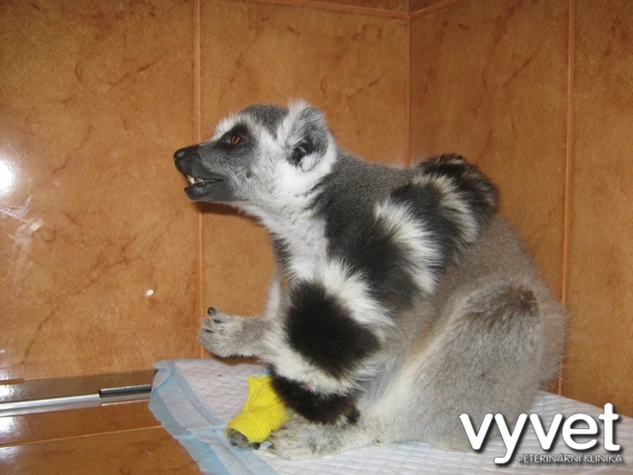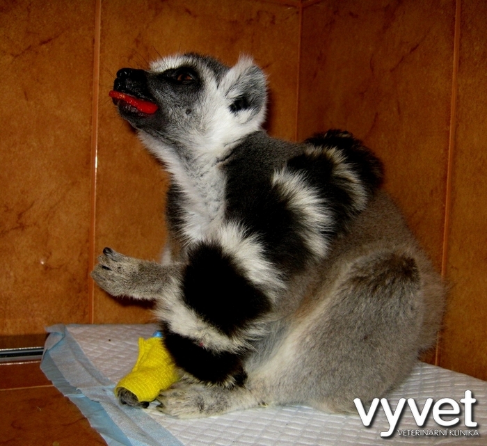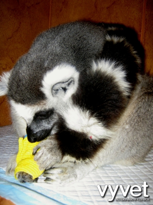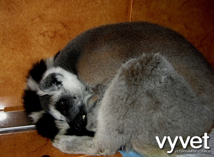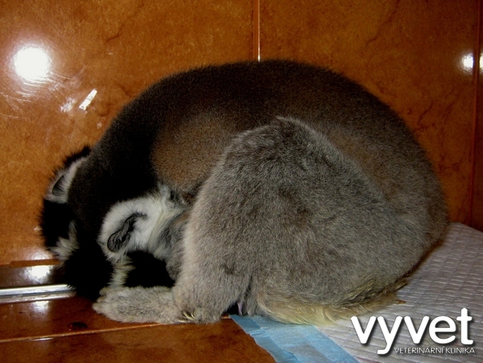 Náš sameček lemura přestával přijímat potravu, zhubnul, stranil se kolektivu ostatních, byl apatický a objevila se žloutenka. Po převezení na kliniku jsme provedli základní vyšetření, rtg, sono a odběr krve. Biochemické vyšetření krve ukázalo zvýšenou hladinu bilirubinu /žloutenka/, ale jinak byly ostatní sledované parametry v normě. Dále bylo zjištěno výrazné zvýšení počtu bílých krvinek, což poukázalo na probíhající zánět. Vzhledem k rtg vyšetření a sonografickému vyšetření břicha a skutečnosti, že konzervativní léčba zatím nepřinesla zlepšení celkového zdravotního stavu jsme přistoupili k tzv. probatorní laparotomii, abychom si udělali lepší představu o tom, co se kolem žaludku lemura děje a také za účelem odběru vzorků postižených tkání k histologickému vyšetření.