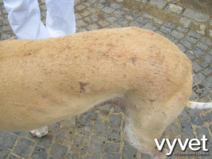 Alopetická ložiska a strupy v bederní krajině a bocích psa.