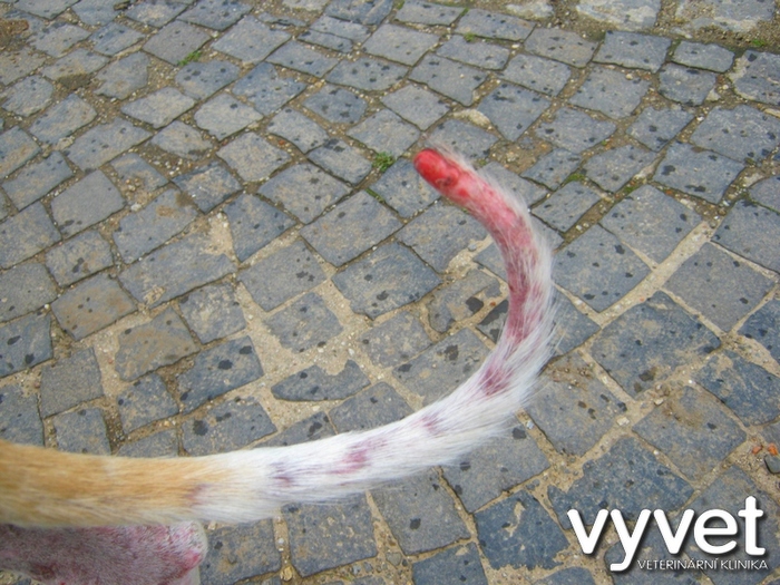 Zánět na ocasu je svědivého charakteru a pes si jej roznesl aktivním okusováním a olizováním ocasu.