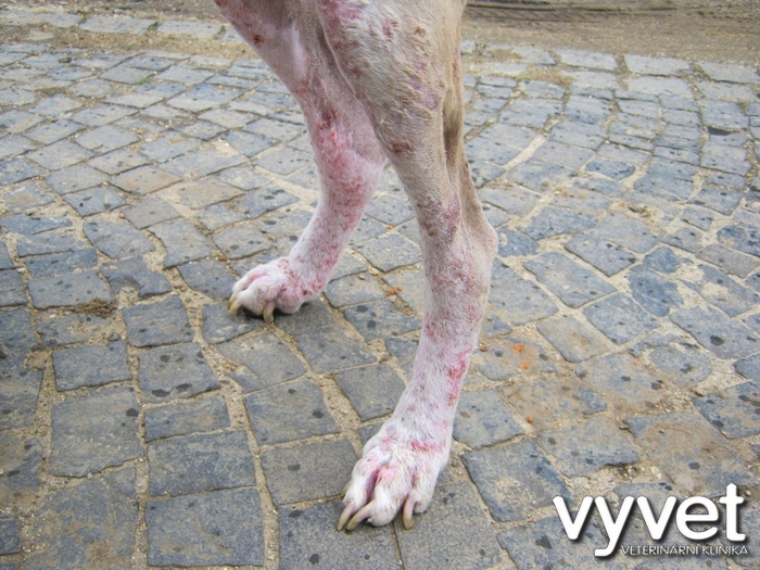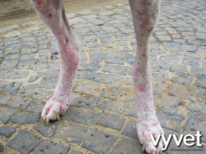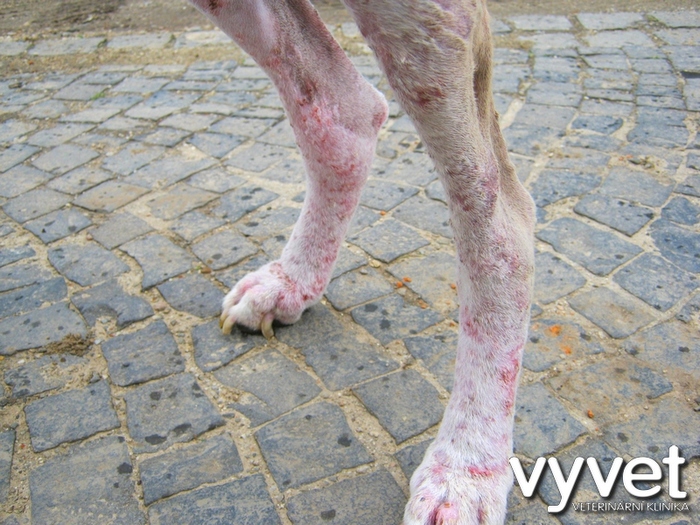 Strupy a ložiska na nohách, zánět postihl kůži tak vážně, že postihl mízní systém a a došlo ke stagnaci lymfy.